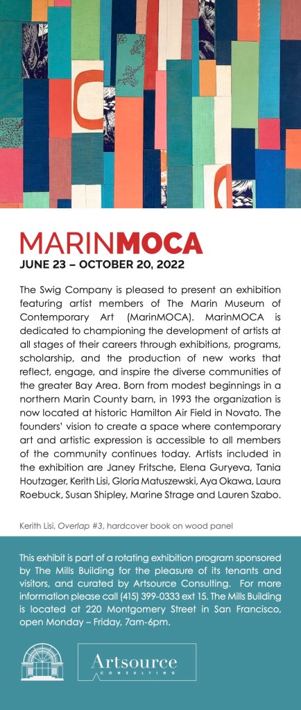 I am pleased to present an Art Exhibition of featuring artist members of The Marin Museum of Contemporary Art (MarinMOCA) at The Mills Building San Francisco. 10 artists were selected by Artsource Consulting to show their work.