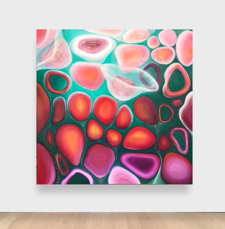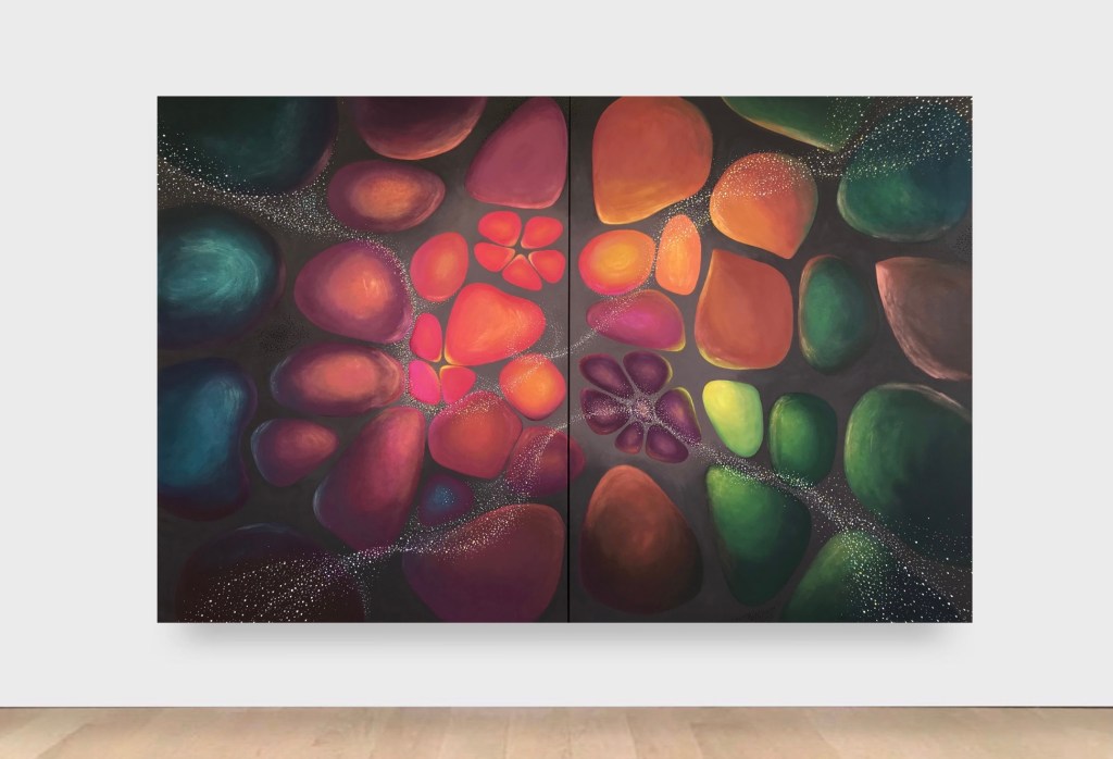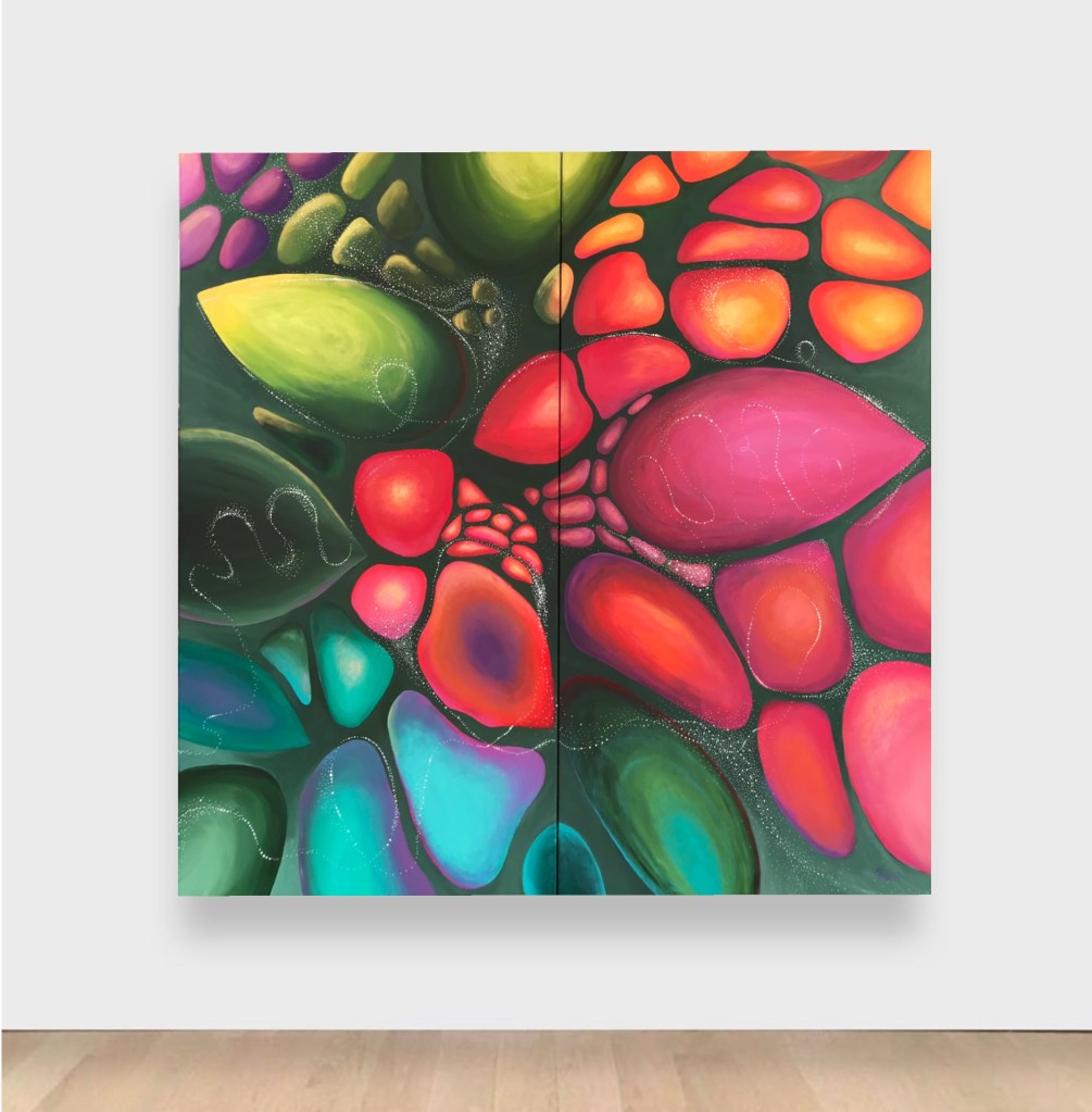 Each painting becomes a quiet meditation on interconnectedness. Repetitive forms echo across scales, dissolving the boundaries between what is near and what is immeasurable.