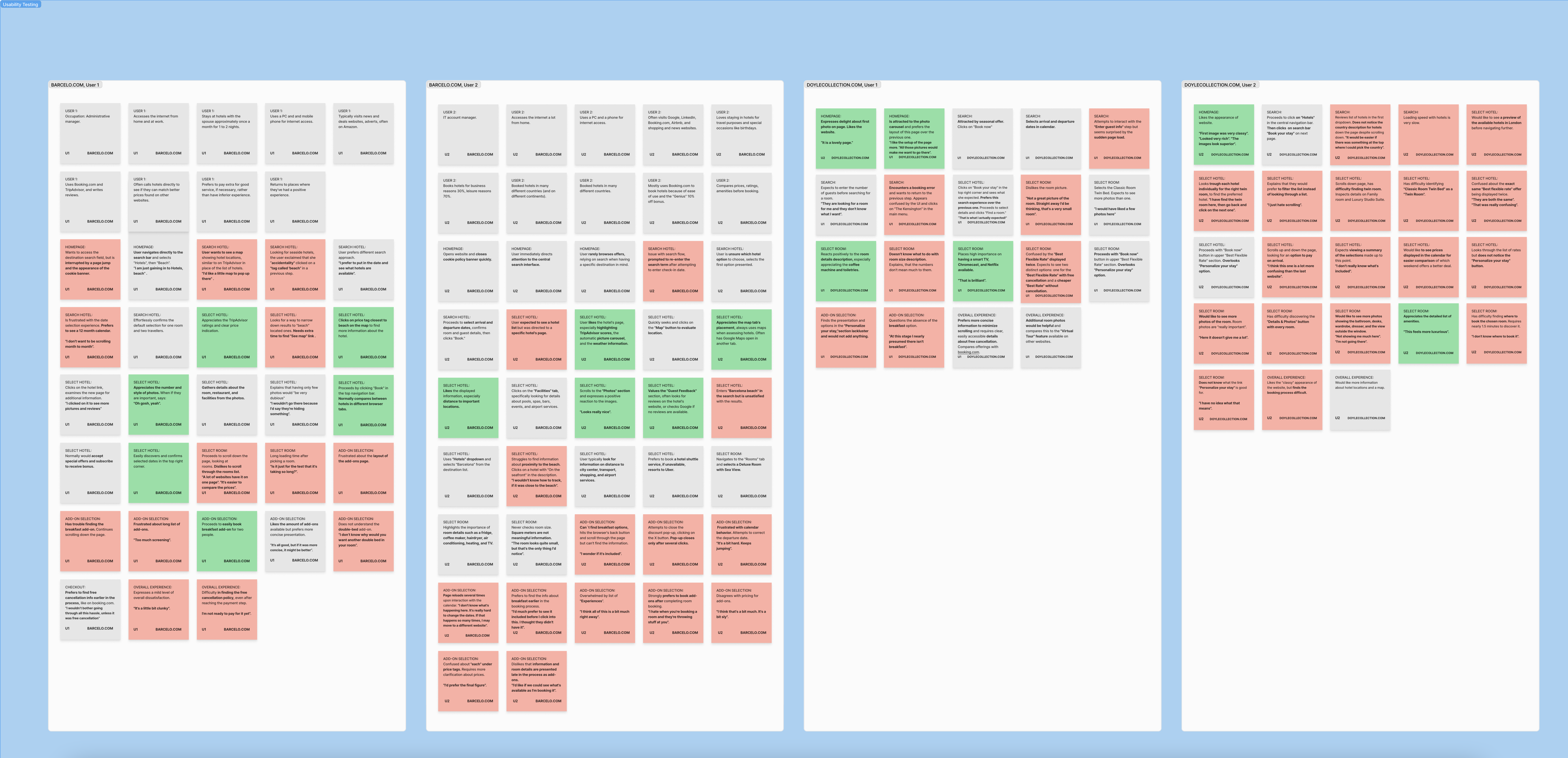 To evaluate real-world user behavior, I conducted and analyzed four usability test sessions on desktop, focusing on the hotel booking experience across Barcelo.com, DoyleCollection.com, Agoda.com, and Expedia.com.