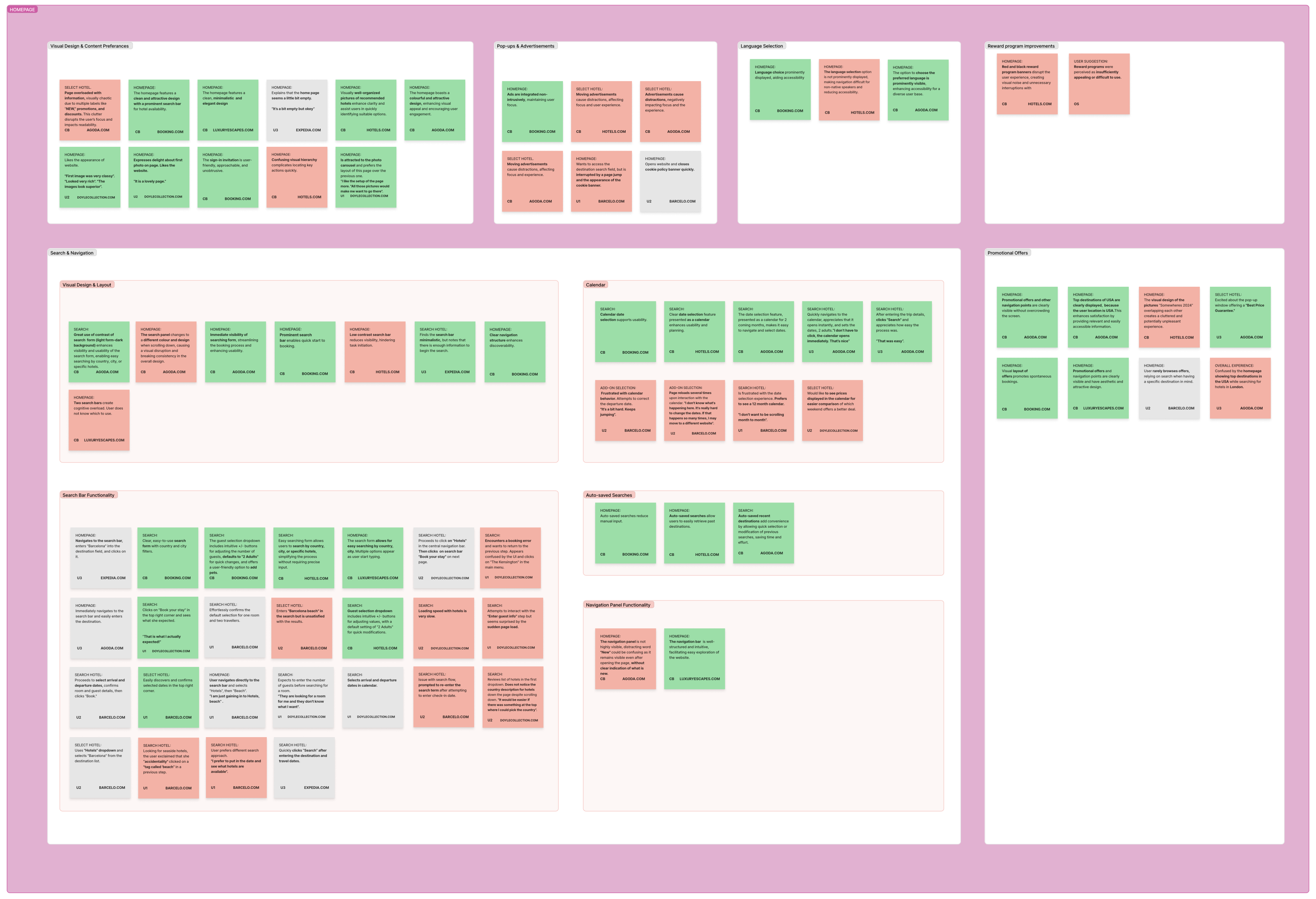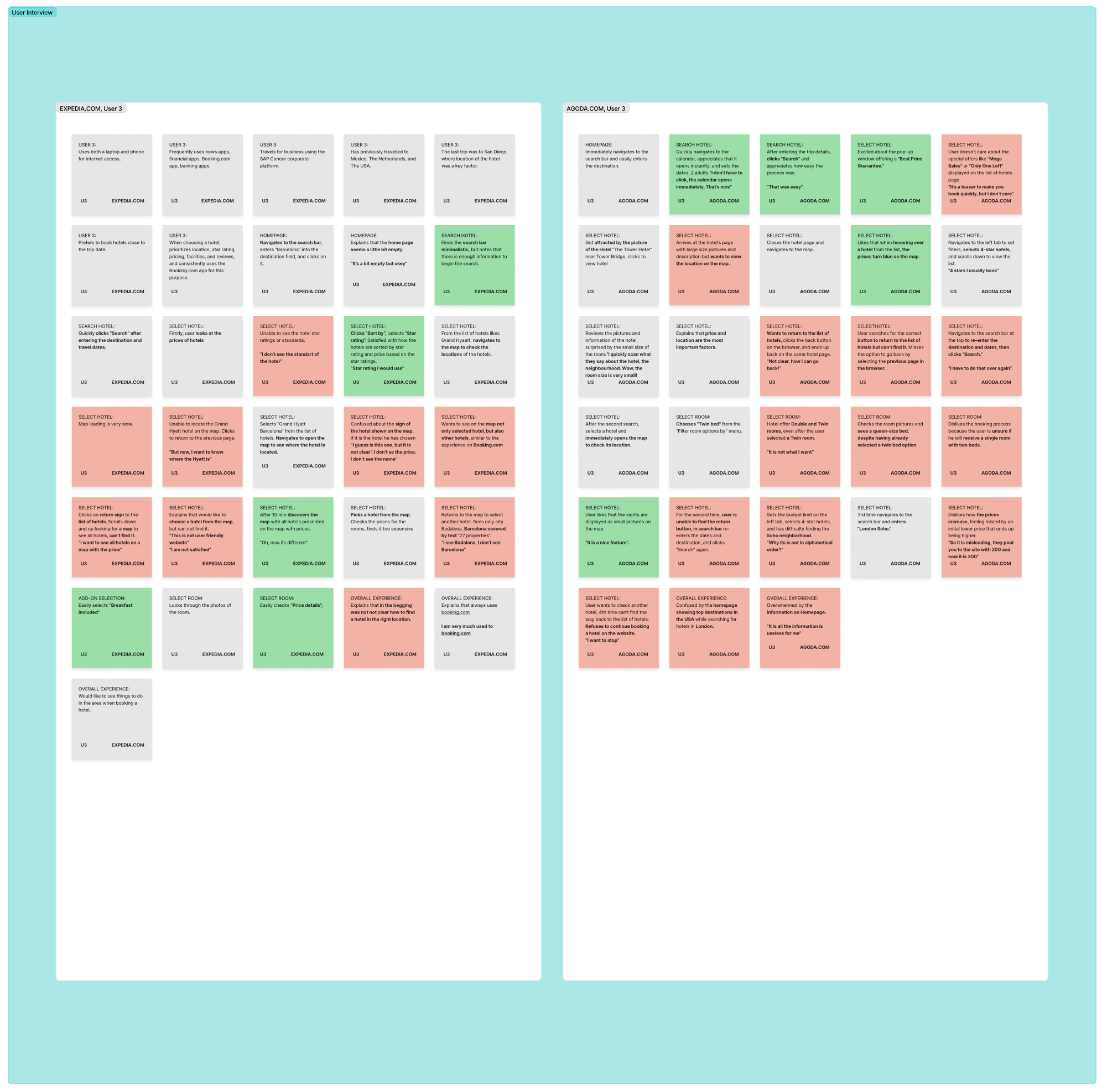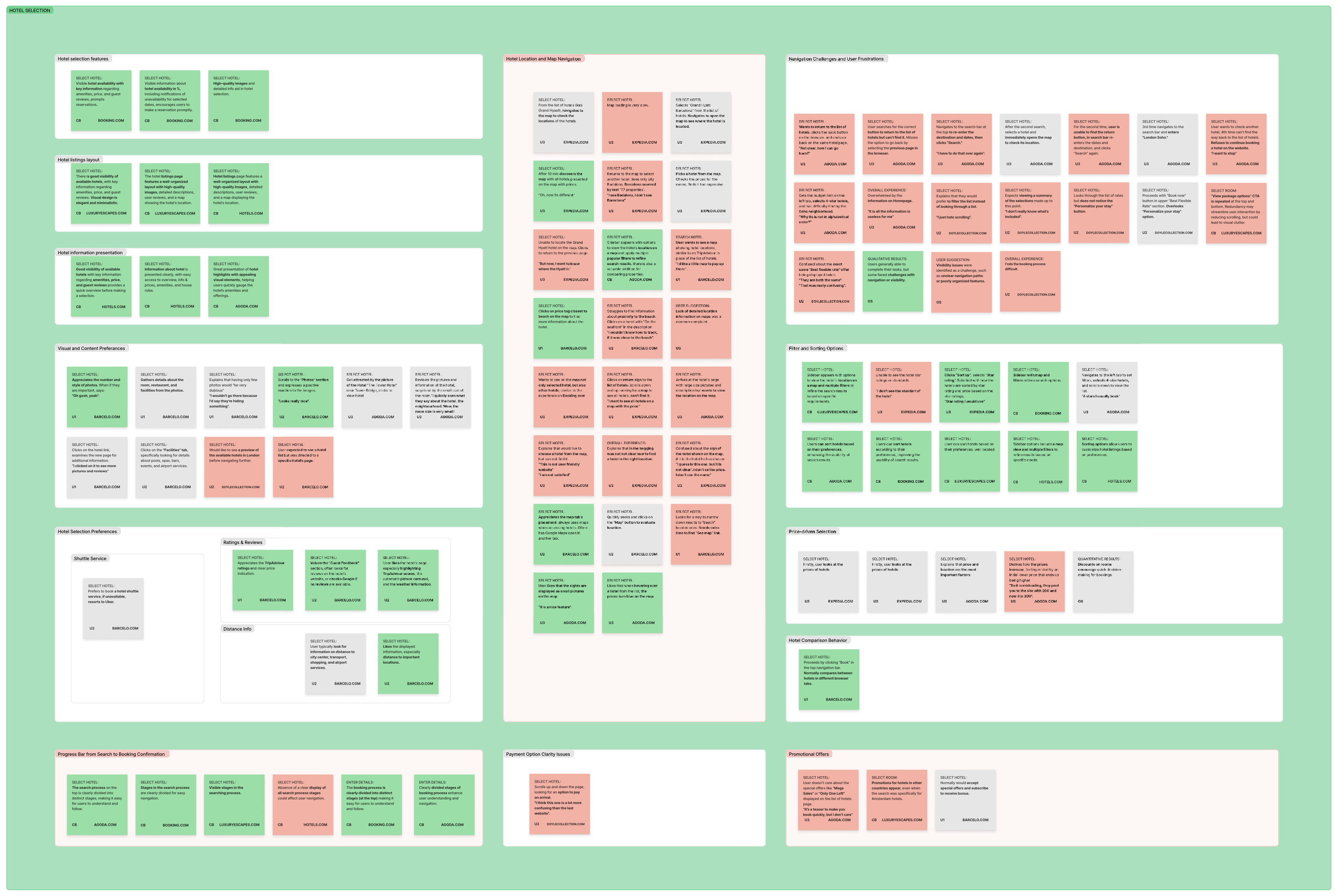 I observed and note-coded video recordings of users as they completed booking-related tasks. Each session was structured by key stages in the journey: