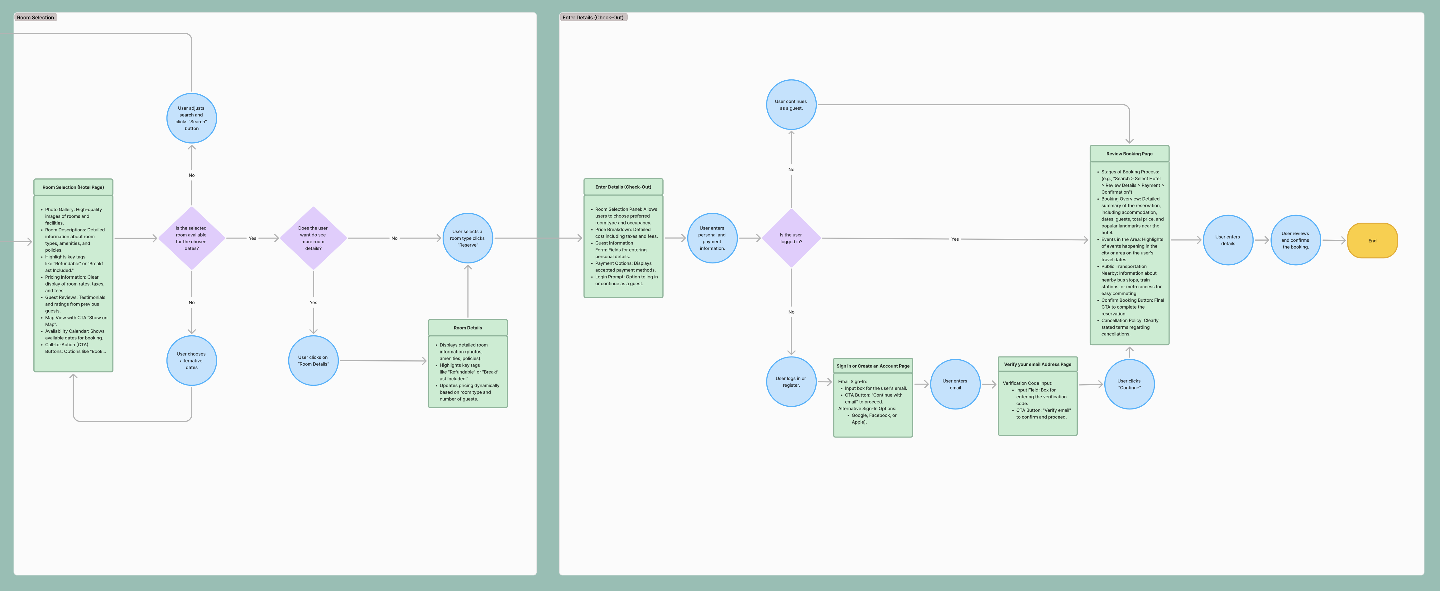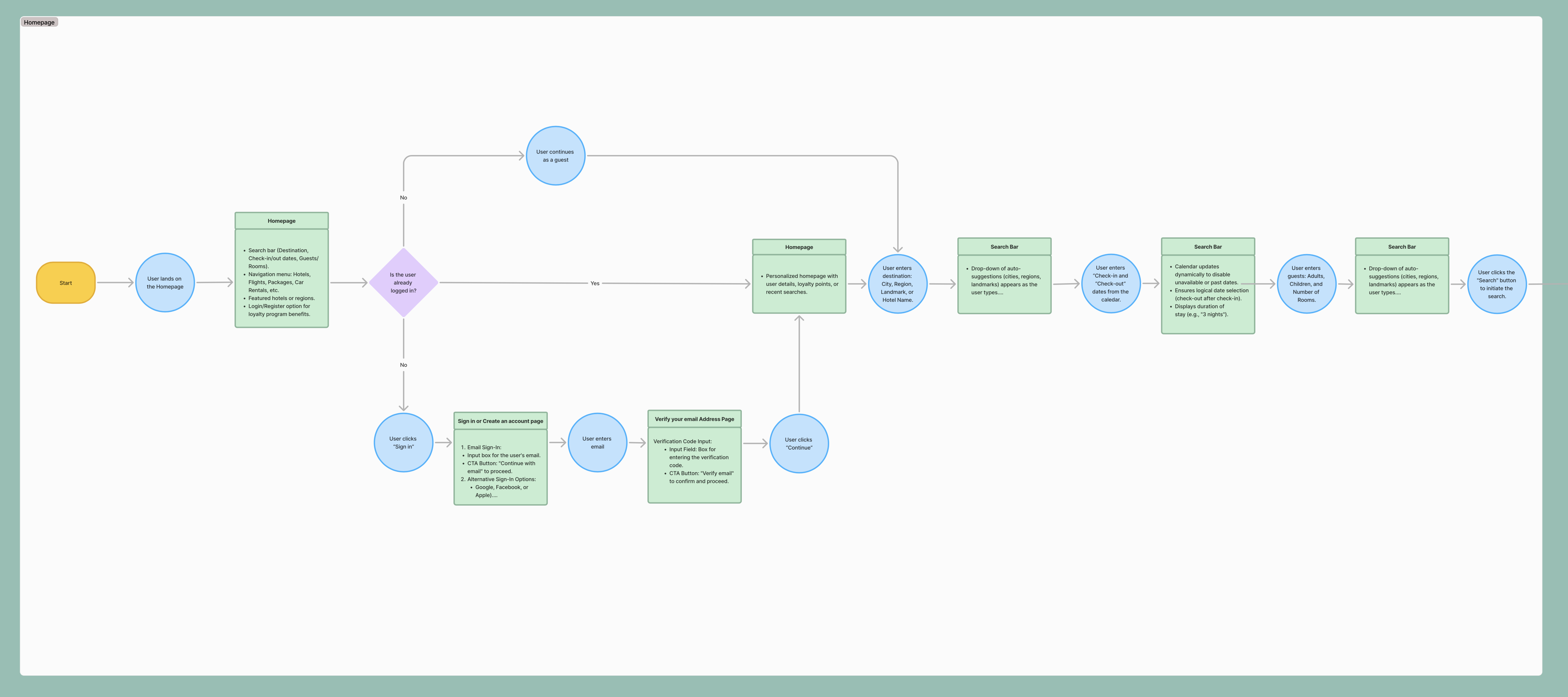 Homepage → Search → Hotel Selection → Room Details → Add-ons → Booking Summary.